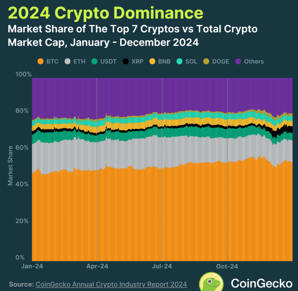 CoinGecko’s 2024 Annual Crypto Industry Report found that Bitcoin (BTC) solidified its position as the cornerstone of the crypto market, increasing its dominance to 53.6% of total market capitalization by year-end.