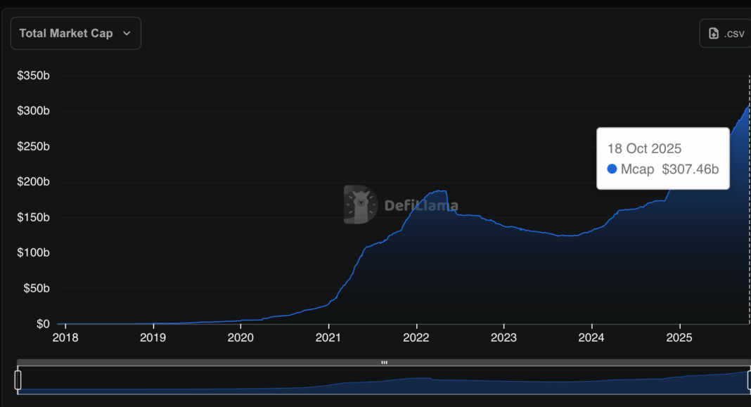 The stablecoin market just set a new record. The total value of dollar-pegged cryptocurrencies has climbed to about $307 billion, the highest on record, even as broader crypto prices remain uneven.