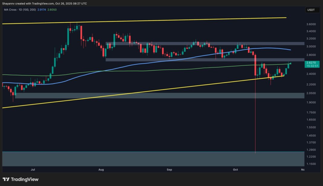 However, the $2.7 supply zone sits just above the moving average, representing a critical obstacle that could reject further upward momentum and maintain price compression within the broader wedge. Therefore, XRP’s behavior around this confluence zone will be pivotal in defining the next directional trend.