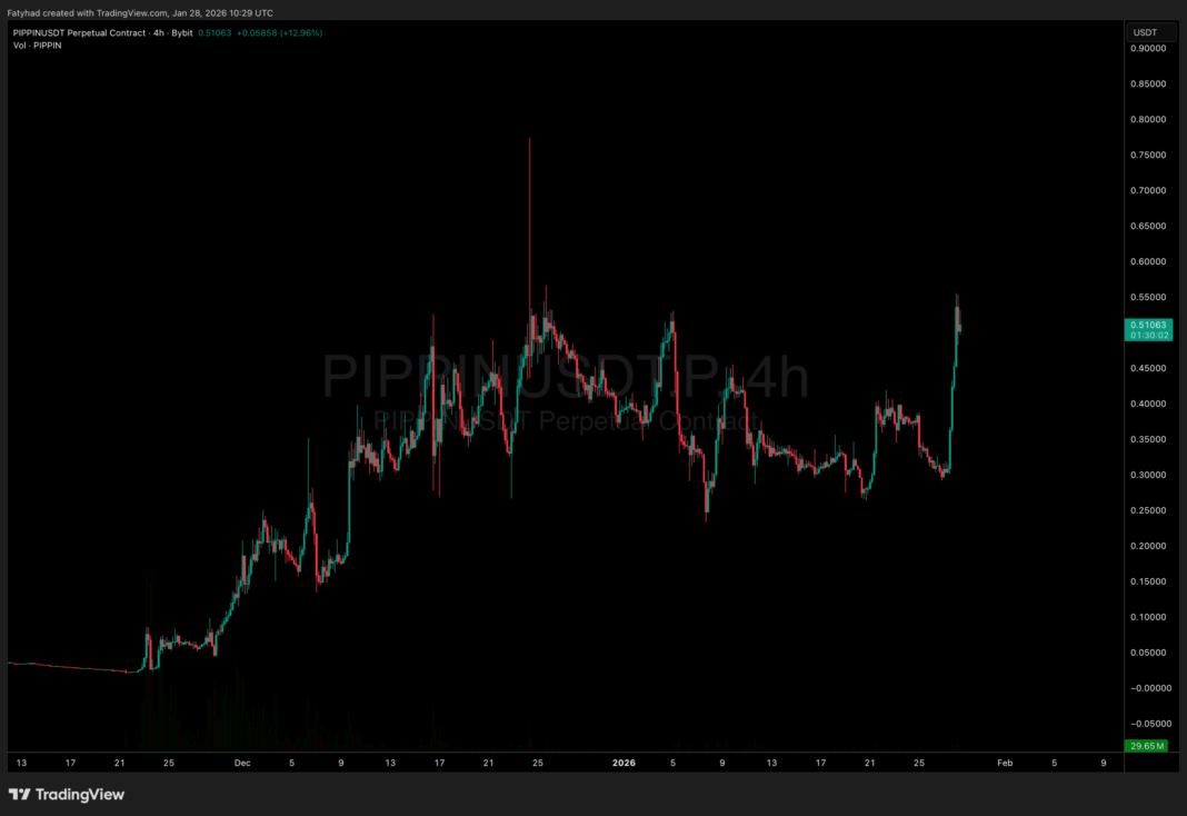 Pippin (PIPPIN) delivered one of the cleanest moves in recent memory, jumping more than 69% in a single day to reach roughly $0.55, now trading around $0.50, and pushing daily trading volume above $122 million. That rally took its fully diluted market cap comfortably past $500 million. But Pippin got us used to these crazy moves, with also very violent corrections.